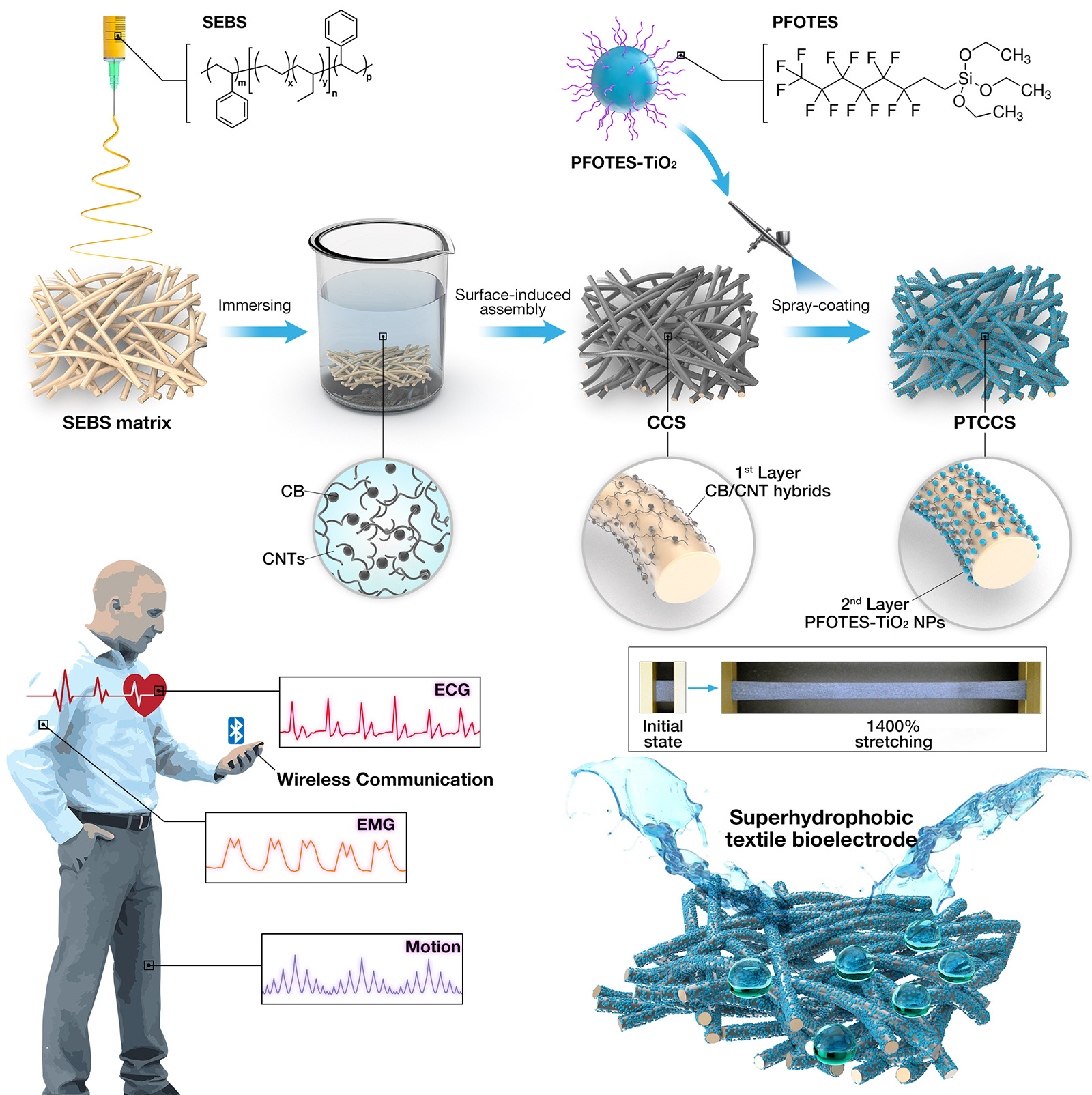 鉴于此,PA视讯官方网站的刘天西教授、黄云鹏副教授与英国伦敦大学公司(University College London)的Ivan P. Parkin教授合作,以高弹性、低杨氏模量、透气透湿的静电纺SEBS弹性体织物为基材,将廉价、高导电性的炭黑/碳纳米管(CB/CNT)杂化导电材料负载于弹性基体以构筑0D-1D杂化导电层,接着将全氟辛基三乙氧基硅烷改性的TiO2纳米颗粒(PFOTES-TiO2NPs)负载于导电层表面,内层自适应、耐形变的CB/CNT杂化导电网络可以在超高拉伸下(>1000%)维持稳定的导电通路,而具有微纳结构和低表面能的外层PFOTES-TiO2NPs能够为导电织物提供超疏水表面。基于此,本工作成功地构筑了一种超可拉伸、具备优异健康监测性能和出色自清洁能力的织物基表皮电极,在作为可穿戴应变传感器时,其具有1050.0%的超宽检测范围和高达1134.7的应变系数。应用于生理电信号监测时,该织物电极能够实时、精确地传输人体心电(ECG)和肌电(EMG)信号。此外,该织物电极还具有极好的自清洁性能,以及对多种腐蚀性液体甚至机械损伤的耐受能力,确保了其在恶劣环境下的性能稳定性。因此,这项研究为开发高性能、可舒适穿戴的表皮电子器件提供了新途径。