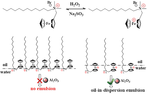 该课题组发现一种含有二茂铁基团的“空间位阻”表面活性剂(FcN+C12),其结构能在单头单尾型(FcN+C12)和双头单尾型(氧化态,Fc+N+C12)间可逆转变,其头基附近的二茂铁基团令该类表面活性剂在油/水界面上排列疏松,高浓度时仍无法实现乳状液的稳定。但在微量纳米氧化铝颗粒的协同作用下,Fc+N+C12能在较低的浓度下稳定oil-in-dispersion乳状液,从而构建了氧化-还原响应的智能型乳状液。另一方面,通过改变体系的pH可以进一步实现oil-in-dispersion乳状液与Pickering乳状液的可逆转变。