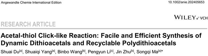 该研究为绿色高效合成二硫缩醛和可回收聚二硫缩醛提供了一种有前景的类点击反应,有利于有机化学、高分子化学、材料化学和药物化学等领域的可持续发展。该工作以“Acetal-thiol Click-like Reaction: Facile and Efficient Synthesis of Dynamic Dithioacetals and Recyclable Polydithioacetals”为题发表在《Angew. Chem. Int. Ed.》上(Angew. Chem. Int. Ed. 2024, e202405653)。文章第一作者是PA视讯官方网站博士生杜帅。该研究得到国家自然科学基金委的支持。