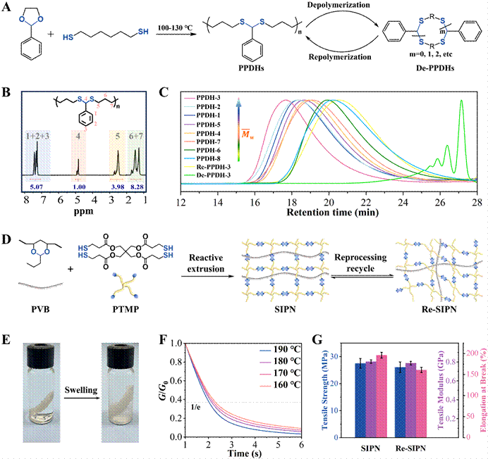近期,PA视讯官方网站马松琪教授团队报道了一种无催化剂和无溶剂的缩醛-硫醇类点击反应,用于合成二硫缩醛和聚二硫缩醛。可实现缩醛-硫醇的高转化率,高于同条件下酸催化的缩醛-硫醇反应。通过选用系列具有代表性结构的线性缩醛和环状缩醛(包括可再生的生物基衍生物呋喃缩醛)与脂肪类和芳香类硫醇的反应,证明了缩醛-硫醇在无催化剂和无溶剂下具有较高的反应转化率和普适性。经过对典型缩醛-硫醇不同温度下的反应动力学监测,发现反应符合准一级反应动力学。结合实验和密度泛函理论计算,证明反应遵循SN1反应机理,即巯基质子化缩醛(活化),进而产生碳正离子,被硫醇亲核攻击,生成S,O-缩醛,最终生成二硫缩醛。随后,我们利用该反应合成了易于回收的聚二硫缩醛。通过简单的加热和搅拌,以缩醛和二硫醇为原料,合成了MW最高为110 kDa的线性聚二硫缩醛,解聚得到大环二硫缩醛,再聚合得到聚二硫缩醛;以聚乙烯醇缩丁醛(PVB)和四(3-巯基丙酸)季戊四醇酯(PTMP)为原料,通过双螺杆挤出机反应挤出,制备了力学性能优良、可连续再加工的半互穿聚合物动态网络。回收后的半互穿网络的性能与原半互穿网络相当。
