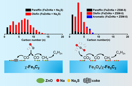 图3.FeZnNa+Na2S催化合成气一步高效制长链α-烯烃,以及FeZnNa耦合H-ZSM5纳米片分子筛两段催化CO2加氢/裂解高效制低碳烯烃