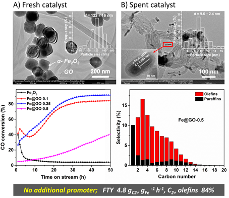 图1.反应条件下原位合成“圆柱状纳米胶囊碳化铁催化剂”及其高效催化合成气反应制α-烯烃