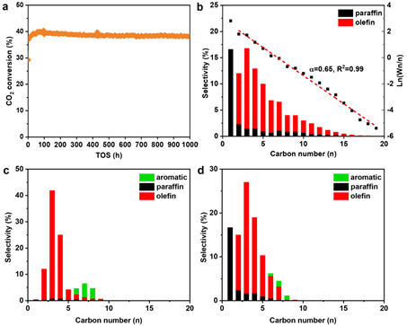 图6.CO2费托合成反应制低碳烯烃一段反应性能结果(a, b)、长链烃类分段裂解产物选择性(c),以及综合产物分布(d)