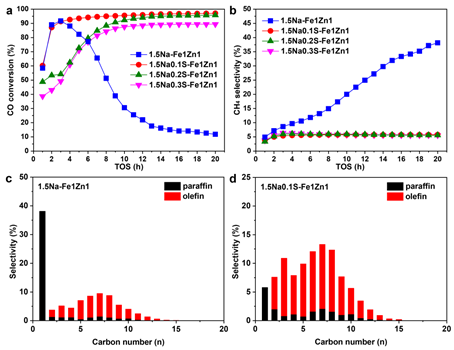 图4.合成气铁基费托合成反应中Na2S对催化稳定性、甲烷选择性,及产物分布的影响