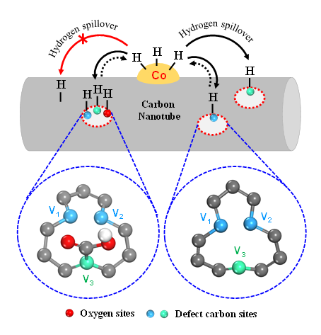图2.碳纳米管(CNTs)载体表面缺陷诱导氢溢流的示意图