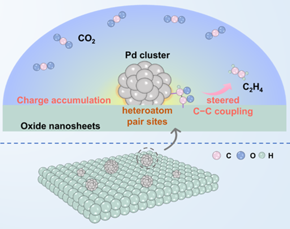 示意图1.半导体纳米片上高活性金属团簇的CO2光还原示意图,其中在界面上构建的具有不同电荷密度的杂原子对位点可以促进C−C偶联生成C2H4