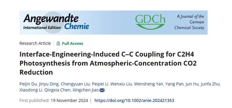 近期,PA视讯官方网站焦星辰教授、陈庆霞副教授与马普所李小东博士合作,在光催化CO2还原制C2燃料方面取得重要进展,相关工作在“Angew. Chem. Int. Ed.”上发表:Interface-Engineering-Induced C–C Coupling for C2H4 Photosynthesis from Atmospheric-Concentration CO2Reduction。该论文​PA视讯官方网站2023级硕士研究生杜佩津、2022级硕士研究生丁金钰为共同第一作者。