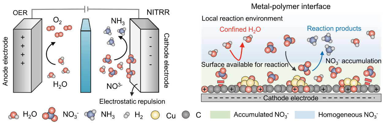 针对上述问题,我们通过电化学原位还原方法构建了一种Cu/Cu2O纳米颗粒/Cu基配位聚合物复合催化剂(图1),其表面可有效调节硝酸盐和水分子的分布/迁移,实现排斥水分子、富集硝酸盐的效果,进而克服低浓度硝酸盐废水中的催化活性和选择性低的问题。在硝酸盐浓度范围为7.1-100 mM的条件下,该复合催化剂的硝酸盐电还原制氨反应法拉第效率都能超过90%;所组装的Zn-NO3电池功率密度为17.9 mW/cm2。本工作深化了对硝酸盐电还原反应过程的理解,为高性能硝酸盐电还原催化剂的开发提供了有益借鉴。