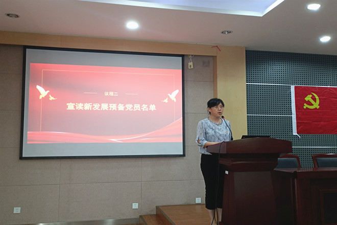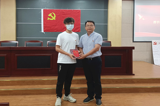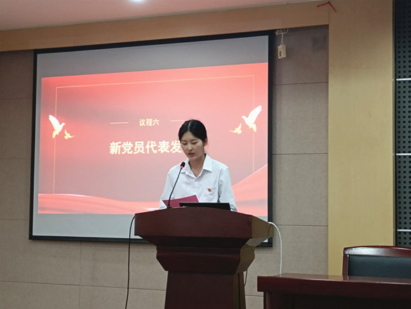 在随后的环节中,公司领导、行政党支部教师和各员工党支部书记共同为预备党员佩戴党员徽章,颁发党章和党史学习教育笔记本。新党员梅佳冰同学激动地说:“戴上党徽的一瞬间,感受到的不仅仅是喜悦,还有那一份沉甸甸的责任。我将不负期望,肩负使命,继续前行!”