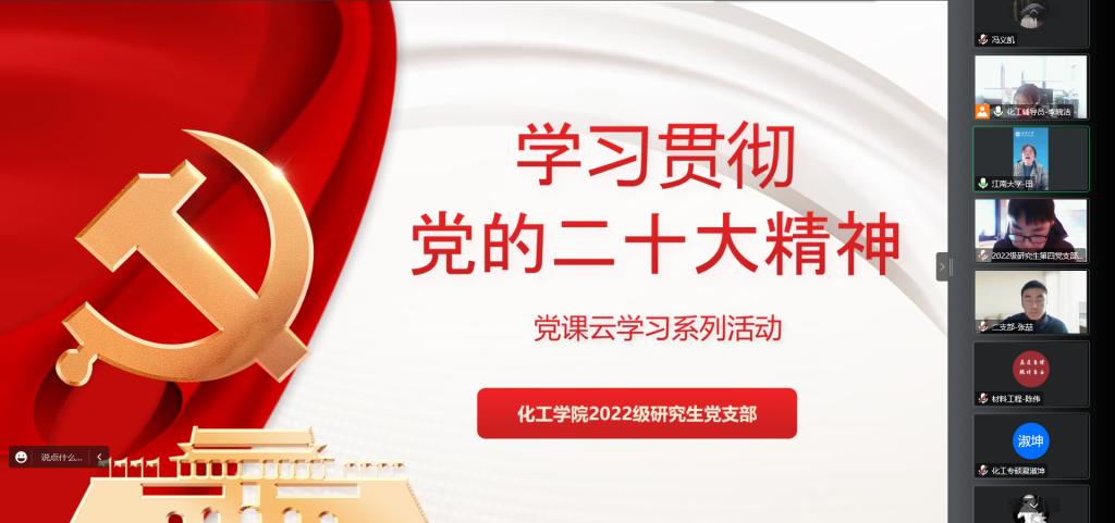 活动伊始,公司党委副书记田卫平为活动致辞,她强调了学习贯彻党的二十大精神的必要性与重要性,鼓励同学们从多角度、多层次、多渠道进行学习。随后,各个支部代表立足于党的二十大报告原文分别从不同角度与党员同志们分享了自己的学习成果。第一支部代表陈依梅以“学习贯彻党的二十大精神,深刻理解中国式现代化的科学内涵”为题,结合中国国情和社会发展的规律和特点,全面阐释了中国式现代化的中国特色、本质要求和重大原则等中国式现代化的重要内核。“为青年党员指明了前进方向”“要怀抱梦想又脚踏实地,敢想敢为又善作善成”……对于党的二十大报告中关于青年工作的重要论述,第二支部代表张喆同志和第三支部代表孙慧敏同志分别以“学习贯彻党的二十大,做新时代合格党员”“学习党的二十大,争做时代青年”为主题,从理论基础,个人理解,青年榜样,名人寄语等方面引领化工青年奋发向上,主动作为,在建设现代版富春山居图的奋斗征程中展现化工材子的精神风貌。在理论学习方面,第四支部代表徐罡以“学习贯彻党的二十大精神——开辟马克思主义中国化时代化新境界”为题,分享了作为新时代青年如何将马克思主义基本原理同中国具体实际相结合、同中华优秀传统文化相结合。其他几位代表也根据自己对理论的理解与学习分享了自己的感悟,在云课堂上,大家积极分享交流,研讨谈感悟,争做新青年。