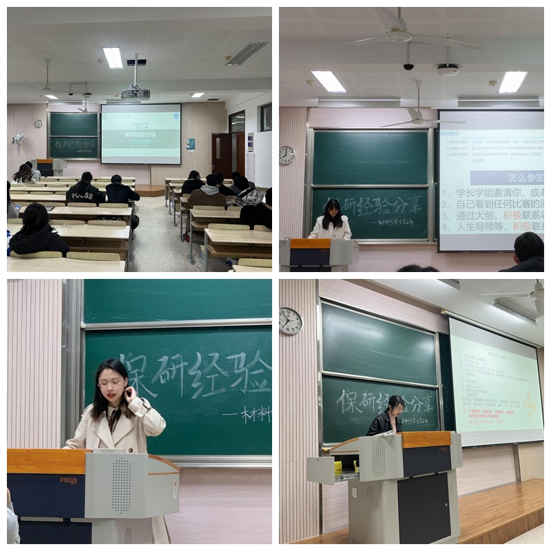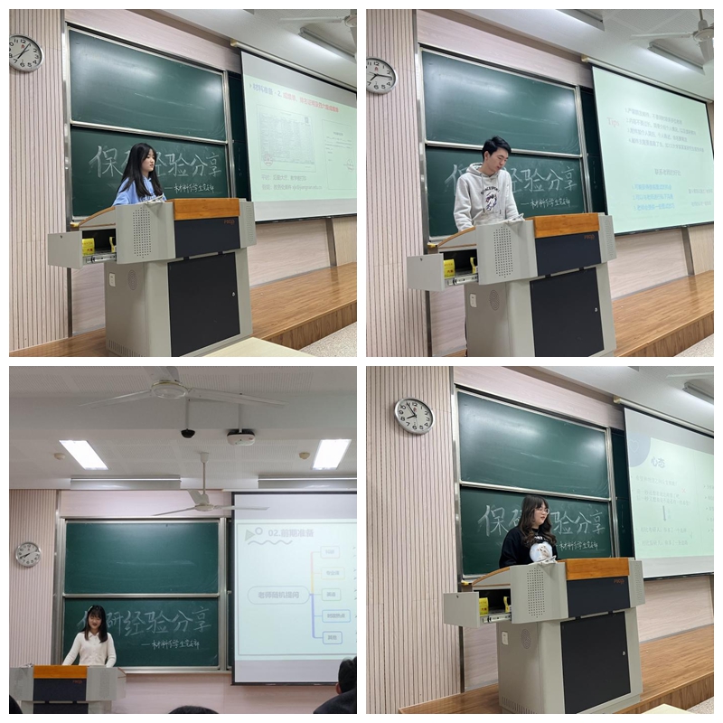 陈梦瑶同学现已保研至中科院宁波材料所。她为同学们详细介绍了保研流程,并用生动贴切的生活实例进行类比,帮助大家加深理解;鼓励同学们积极参与科创活动,提高自己在保研中的核心竞争力。此外,她也结合自身的经历,针对“社恐”如何寻找导师和“高校or研究所”等问题进行了分享,语言风趣,现场气氛热烈。欧凯琴同学现已保研至复旦大学。她为同学们分享了院校选择的经验,首先要根据自身的目标和本科公司的水平选择心仪的梦校,在夏令营、预推免、九推等不同阶段当中有选择性地投递,并且将自身的能力特长与相关院校的招生期望进行自洽。作为一名优秀的保研学子,她在众多院校面试通过的经历也为学弟学妹们带来了宝贵的经验。陈佩茹同学现已保研至浙江大学。她针对各类保研文书的准备,为大家进行了详细的介绍,从相关证件、荣誉证书、自我介绍、简历、PPT制作、专家推荐信等多方面,为大家分析这其中的逻辑和针对性话术;也向同学们推荐了在文书准备过程中较为实用的App和网站,干货满满。张明通同学现已保研至中国科学技术大学。他结合自身经历,向同学们分享了在选择和联系导师过程当中的经验。从导师的年龄、头衔、研究方向等不同角度,为同学们详细分析了其中的优缺点;也教大家如何利用网络信息寻找到自己心仪的老师。语言幽默风趣,结合身边实例和自身经历,为同学们提供了参考。董媛同学现已保研至浙江大学。在她的分享过程当中,列举了来自不同高校的大量真题,从专业知识、科研经历以及英语问答等,为同学们提供了宝贵的第一手消息。她强调,一定要对自己的科创经历非常熟悉;同时,她也向大家分享了一些实用的面试技巧,如何在面试中扬长避短,展示自己。赵思雨同学现已保研至华南理工大学。她则从“保研边缘人”这样一个特殊的视角,为大家分享了平衡保研和考研这两件事情的独到经验,二者在时间线上的关键节点并不重合,合理安排可以为自己带来更多的机会。压力固然有之,但更多的是动力;柳暗花明,殊途同归的那一刻,双倍的努力带来的是双份的喜悦。林杰荧同学现已保研至中国科学技术大学。在参加竞赛方面,她为同学们提出了切实有效的多种路径。丰富翔实的竞赛经历,不仅仅是外校面试时的核心竞争力,也是本校保研名额的重要加分项。此外,她也以自己独到的视角,为同学们分享了保研路上缓解焦虑的好方法。