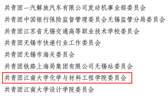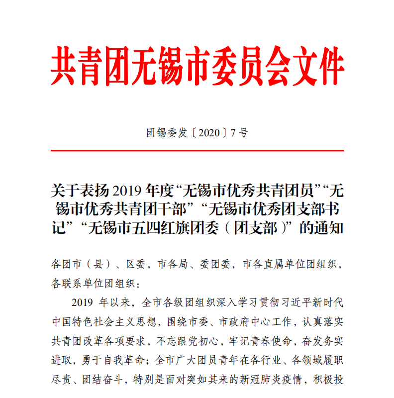 近日,共青团无锡市委员会发布《共青团无锡市委员会关于表扬2019年度“无锡市优秀共青团员”“无锡市优秀共青团干部”“无锡市优秀团支部书记”“无锡市五四红旗团委(团支部)”的通知》,共青团PA视讯官方网站委员会获得2019年度“无锡市五四红旗团委”荣誉称号。