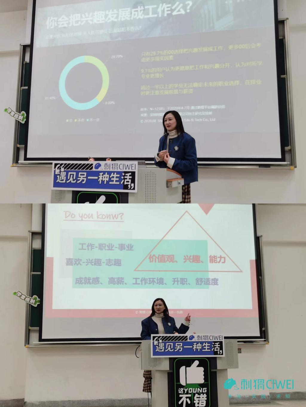 在给同学们抽奖带来10个B站全年会员名额,使得现场气氛达到顶峰后,刺猬平台联合创始人曹琰副总裁为同学们进行了一场题为“如何选择适合自己的第一份工作”的职业分享会,内容主要包括“后疫情时代就业趋势分析”“如何找到最适合自己的实习”“易学好用的简历与面试秘籍”等三个板块。曹琰副总裁指出,在后疫情时代,成长性更高的工作更受欢迎,企业也更倾向于选择富有创新思维、追求自己热爱的复合型人才;同学们在寻找自己的第一份实习时,应该遵从内心的声音,从价值观、个性特点、工作意愿、业务能力和学习能力等方面寻找适合自己的实习;在简历制作与面试准备方面,同学们应学会从企业HR的角度来审视自己的简历,调整好自己的心态,并针对校招的考察点进行充分准备。