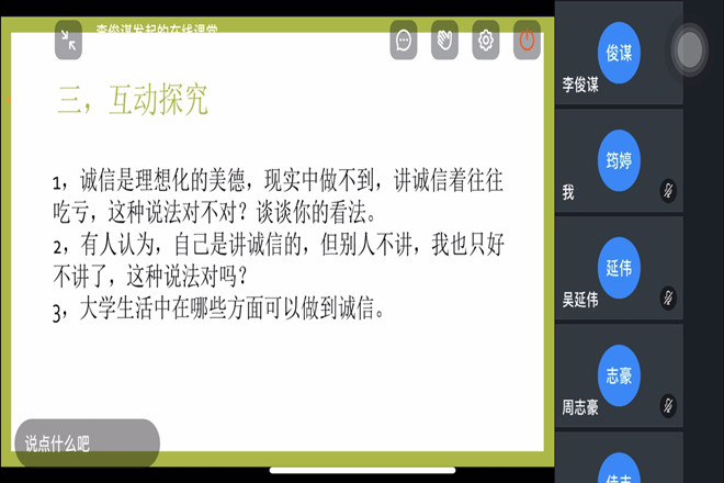 在了解完员工资助后,李俊谋带领大家进入了诚信部分的学习。由弘一大师、葛洪和孔子的名言引出诚信是中华民族传统美德,并讨论诚信的内涵是什么,引人深思。接着又通过“金斧头、银斧头”和“网络电信诈骗”的故事,同学们进一步感悟了诚信的意义,“人而无信,不知其可也。”最后,同学们还进行了有关诚信的互动探究,展开探索诚信对人的意义,同学们积极发表自己的观点,表达了自己对诚信问题的看法。