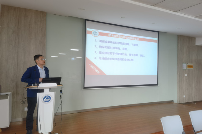 座谈会后,董玉明为毕业生党员们开展了题为“不忘初心、牢记使命;自信诚信、再续辉煌”的学术诚信教育专题党课。董玉明从习近平总书记提出的“新时代人才强国战略”为出发点,详细讲解了新时代党和国家对人才的渴求与实现中华民族伟大复兴宏伟目标之间的必然联系。而实行人才战略,学术诚信是可持续发展的基础。董玉明对此提出四点学术行为准则:确保成果中的科学数据可靠、可重现;确保文献引用准确、完整;建立规范的学术管理办法,便于追溯、核实;形成健全的学术道德和自律习惯。随后,董玉明提出了“个人软实力”的概念,再次对个人诚信的重要性加以阐述强调。党课最后,董玉明向完成学业、顺利毕业,即将迈向人生新征程的毕业生党员们表示了祝贺与期望:“今天我们以江大为荣,明天江大以我们为荣。希望同学们今后在各自的科研领域大展宏图,为中华民族伟大复兴贡献力量!”