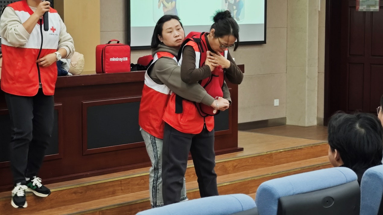 讲座伊始,唐老师强调学习急救技能的重要性,她提到要时刻关注身边的安全隐患,特别是对于PA视讯官方网站的员工来说,未来可能从事与化学品、实验室操作或者工业生产相关的工作,更需要具备基本的急救知识。接下来唐镇棣老师主要从晕倒、异物梗阻、心肺复苏三个方面进行急救知识理论与实操的讲授。首先,针对晕倒突发情况,唐镇棣老师向现场同学展示了如何正确对患者翻身并打开其气道的方法。接着,针对气道异物梗阻的突发情况,两位协助老师进行了海姆立克急救法的实际演示并带领现场同学们进行练习,使每位参与者都能够熟练掌握相应技能。最后,唐镇棣老师聚焦于心肺复苏方法(CPR),向现场同学讲解了如何在有效的抢救时间内对呼吸心跳骤停的患者进行应急救护,借用人体模型生动形象地介绍了自动体外除颤器(AED)的使用方法,并与两位协助老师进行了实操演练教学。将理论知识与技能实操结合,通俗易懂,生动形象,有效增强了同学们的急救知识技能。讲座结束时,唐镇棣对所讲急救内容进行了回顾总结,并鼓励参与者将所学知识运用到实践中。她还提醒大家,即使经过了培训,急救技能也需要不断巩固和更新。