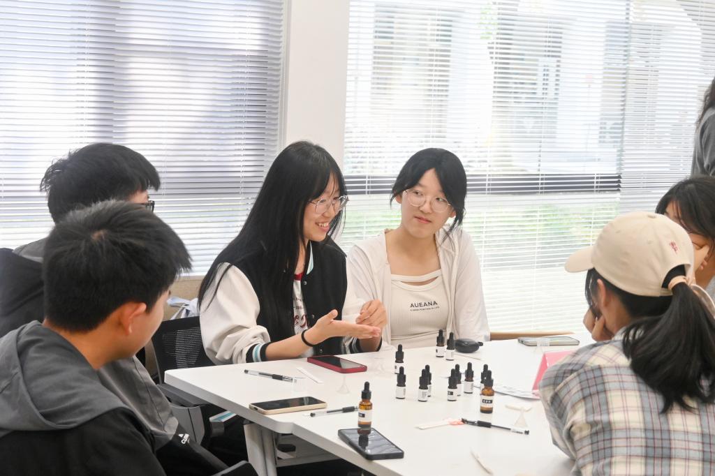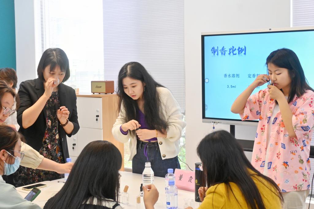 在心理团辅环节,董霞带领师生共同做了冥想训练和“天生我才”自我探索练习。在调制香水环节,储鸿科普了调香的基础知识,并与现场的志愿者一同指导师生调制香水。在选择香精和调制香水的过程中,各小组积极交流互动,在实操环节互帮互助,最终每位参与者都得到了一瓶代表个人江南记忆的香水。活动最后,每位参与者将自己亲手制作的香水喷在手中的留香条上,在留香条上写下一句寄语或祝福送给在场的最想送的人,并合影留念。