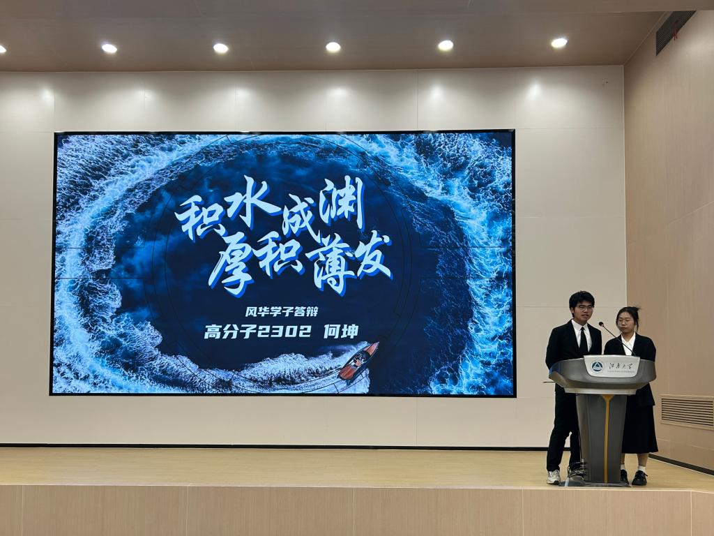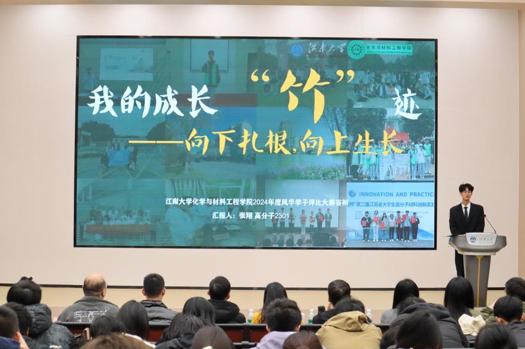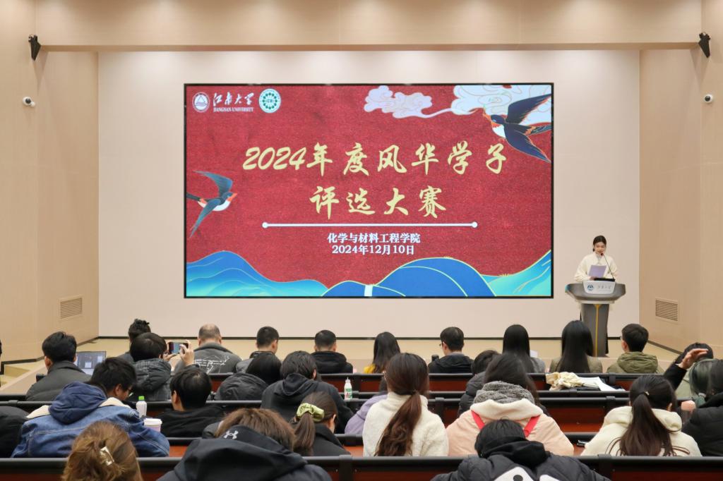 首先进行的卓汇菁英类竞选,李家豪等同学分享了他们在科研探索和党务工作中的卓越表现,展现了化院学子的理想追求与责任担当。他们的故事激励每一位在场的同学,传递勇于追梦的精神力量。在学研精进类展示中,赵伊等同学积极响应国家战略,立足科技前沿,勇于创新,在各自的领域取得丰硕成果。他们不仅展示了年轻学者追求卓越、勇攀高峰的精神风貌,还为同学们树立了学术研究的标杆。在坚毅追光类展示中,周康杰同学以其坎坷的求学经历和在科研中拼搏奋斗的故事,深刻诠释了“坚毅是拼搏的底色”。他用自己的经历勉励学弟学妹们在面对困难时保持坚定信念,勇敢向前,书写属于自己的辉煌篇章。在践行先锋类展示中,方承格等同学秉承开拓奉献的精神,积极参与员工工作和志愿服务,成为连接公司与员工的桥梁。他们不仅在日常学习生活中展现了优秀的领导和组织能力,更在实际生活中彰显了新时代青年的风采与力量。在文体风尚类竞选中,陈丹萍等同学在体育活动中表现出色,在市、校、院级比赛中取得佳绩,以拼搏进取的精神闪耀舞台。他们不仅个人成绩斐然,更带领团队屡获佳绩,摘得各级奖项。他们的表现充分展现了青年人应有的活力与激情,彰显了青春无畏、奋勇向前的精神风貌。