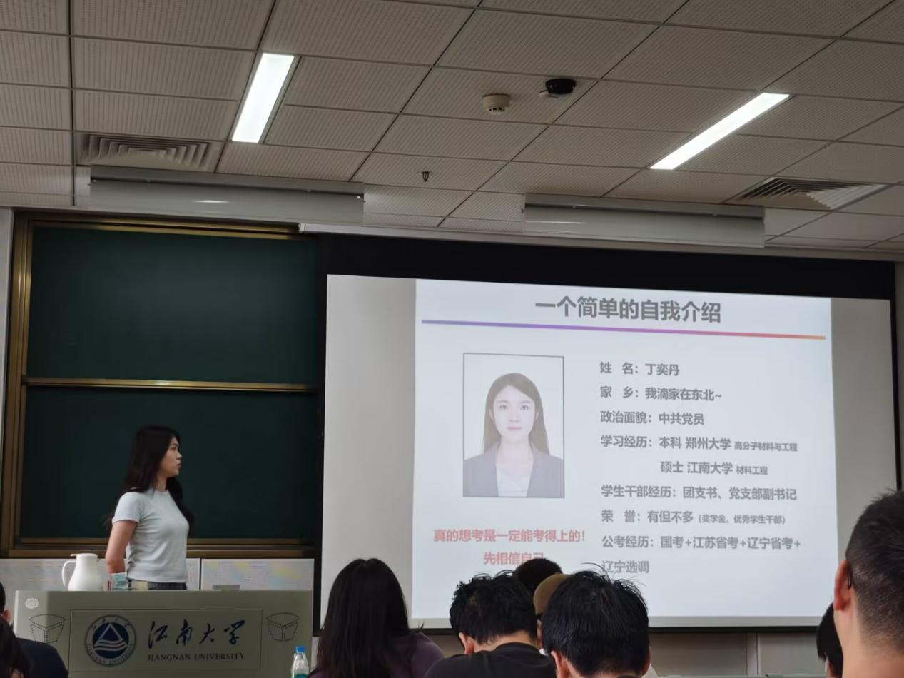 随后,成功上岸的优秀员工代表分享了他们的经验。丁奕丹同学作为辽宁选调生,秉持“事缓则圆,相信自己”的信念,结合自身经历,分享了选调生考试的特点、备考方法以及在备考过程中如何调整心态。从专业科目复习、资料筛选、时间管理等方面展开,结合实际案例,生动形象地展示了如何在激烈的竞争中脱颖而出。鼓励同学们勇敢尝试,积极备考。