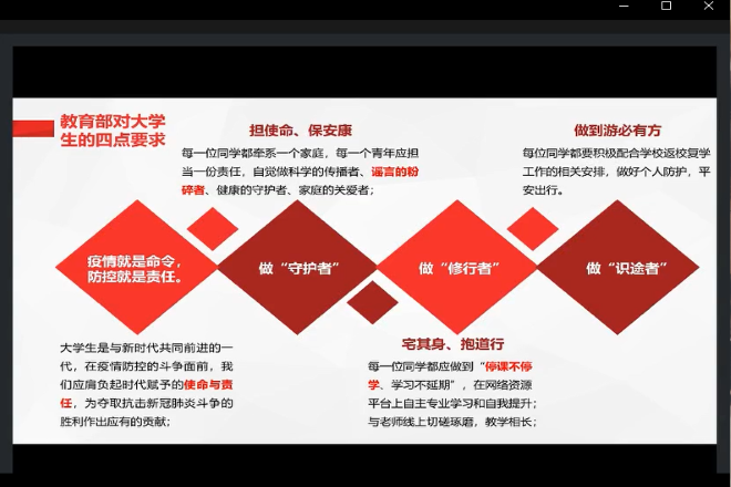 至此,高静老师带给青马训练营的学员门一堂精彩而又生动的课。课程虽然结束,但是学员们的学习还在进行,相信他们已经开始担负自己的责任,提升自己的能力,在疫情期间做自己最大的努力!