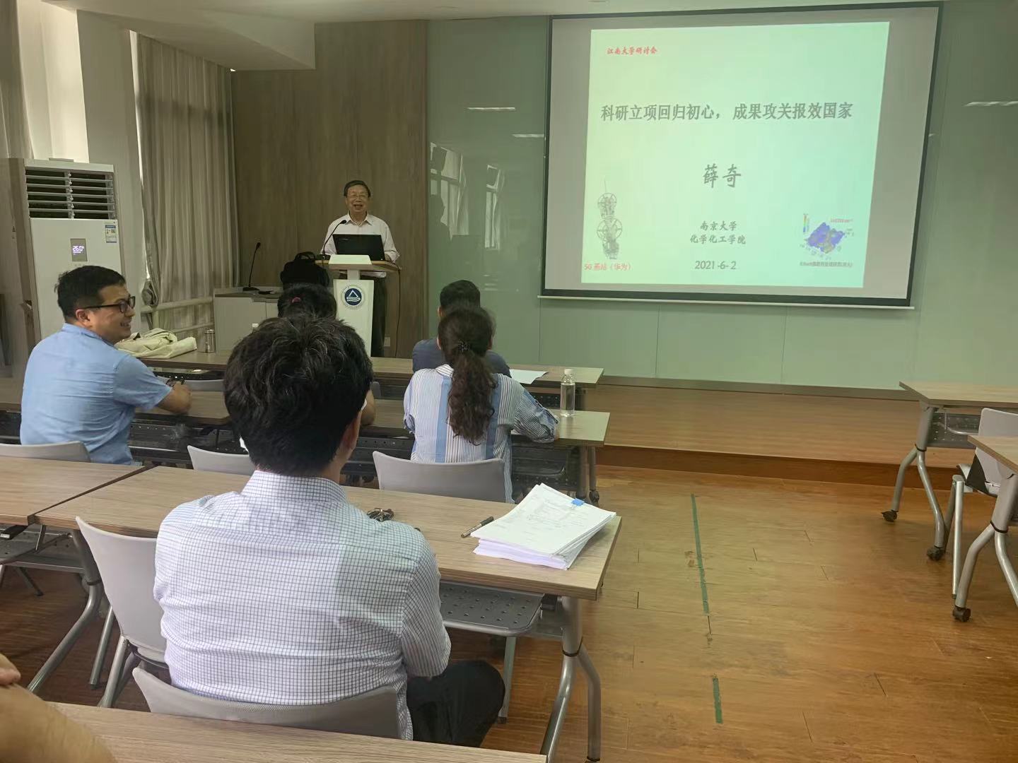 6月2日下午,南京大学化学PA视讯官方网站薛奇教授应公司应化系党支部邀请来访交流,并讲授了题为“科研立项回归初心,攻关成果报效国家”的党课讲座,讲座由顾志国副经理主持,他对薛奇教授的来访表示热烈欢迎,公司师生党员参加此次活动。薛奇教授以自身的求学经历和知识分子入党故事开篇,结合自己及团队丰富的研究经历以及荣获国家自然科学奖、国家科技进步奖的卓越成果,就科研工作如何选题,做立意高远、紧扣或引领学科前沿的基础研究,或“接地气”、可上货架的具有竞争力的高质量应用研究,开展面向国民经济主战场的高水平创新研究工作进行了专题报告,勉励我们要怀揣家国情与梦,要有抓机遇、敢于担当的使命感,激励我们以昂扬姿态更好地投入教学科研工作,开展“顶天立地”的科学研究,以优异成绩迎接建党一百周年。