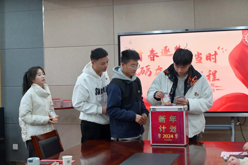 活动在央视短片《2023,记得》中拉开帷幕。短片回顾了过去一年我国在攻坚克难中不变的热情与坚守,其中不乏青年人勇担重任、冲锋在前的身影。观看视频后,班长付博元领学了习近平总书记新年贺词,引导同学们从贺词中领会总书记对青年的关心期望,汲取奋进力量。随后,他总结了2023年班团工作,并对2024年的班团建设提出了展望和目标。接下来,国家奖学金获得者陈鲁文,团支书、至善生李子洋,校级重点老员工创新项目负责人王东仑依次发言,分享了他们的新年计划。全体同学书写了自己的新年计划卡,并投入班级新年计划箱,待次年开启时一同见证更好的自己。接着,班主任常宽和班长付博元共同签订《班级优良学风建设目标责任计划书》。