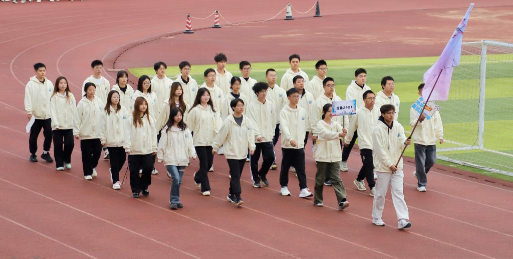 旗帜在微风中猎猎飘扬,护旗方队、院旗方队及各班级代表队整齐列队入场。运动员们精神抖擞,步履矫健。