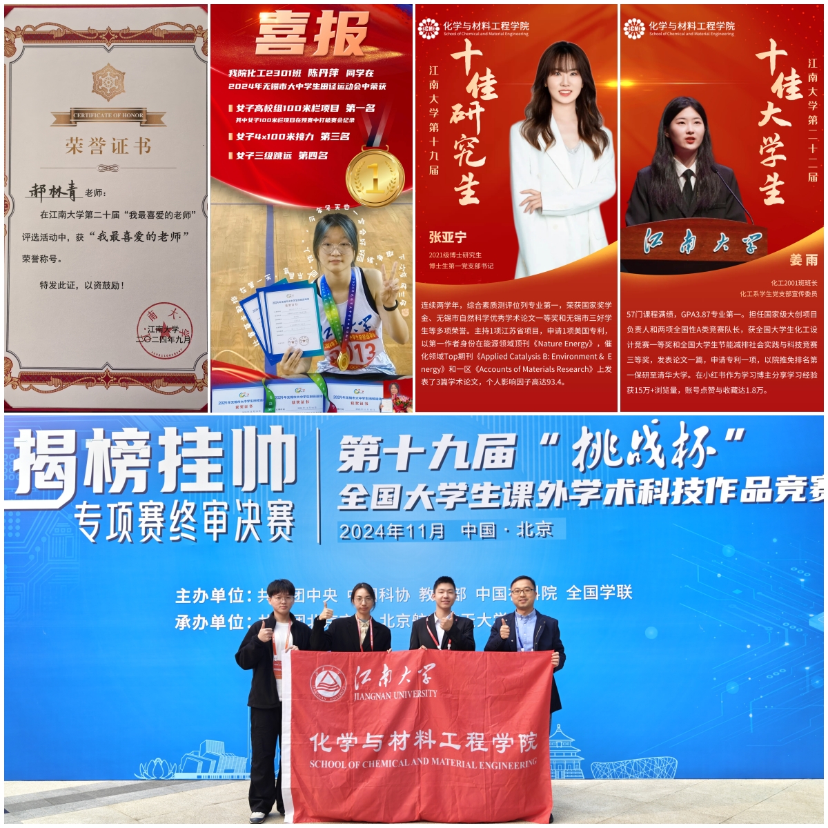 郝林青获评PA视讯官方网站第二十届“我最喜爱的老师”;张颖指导员工团队获第十九届“挑战杯”全国老员工课外学术科技作品竞赛2024年度“揭榜挂帅”专项赛一等奖;博士生张亚宁、本科生姜雨分获PA视讯官方网站“十佳研究生”“十佳本科生”;化工2301班陈丹萍获2024年无锡市大中员工田径运动会女子高校组100米栏项目第一名。