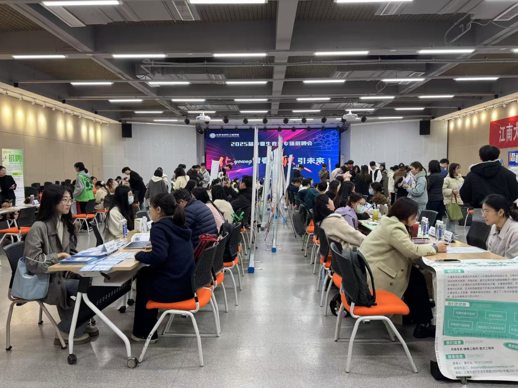 本次招聘会共设展位48个,吸引了多家优质企业参会,提供涵盖应用胶体与界面化学、化妆品、催化新技术、功能材料、高分子材料和涂层材料等领域的岗位300余个,招聘专业涉及应用化学、高分子材料与工程、化学工程与工艺、材料科学与工程、材料工程、化学工程与技术、化学工程、材料化学,吸引了公司200余名员工到场咨询应聘,现场气氛热烈。