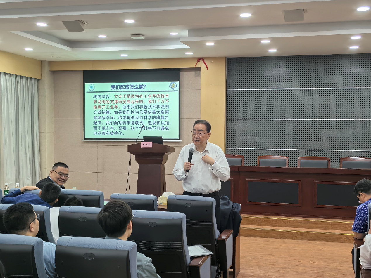 报告会上,程院士以宏观视角梳理了高分子科学百年发展脉络,通过详实案例解析了高分子材料对现代工业与生活的革命性影响。围绕学科发展面临的五大核心挑战——重构高分子定义、发掘新现象、突破材料创新、革新工艺方法、提升表征技术,他提出“创新方法论”的解决路径。在谈及人工智能与大数据技术时,程院士强调:“智能化工具可大幅提升科研效率,但无法替代科学家对实验数据的直觉感知和工程师的实践智慧”,其精辟见解引发在场师生的深度思考。在系统阐述高分子学科发展脉络的同时,程院士更以学者风范传递治学智慧。当论及科研创新时,他援引“敢于走到荆棘满地的地方去挖掘”的探索精神,强调“要做与别人不一样的东西”的原创追求;谈及人才培养时,提出“教育员工从平凡到优秀,从优秀到出类拔萃,才是我们能力的体现”的育人理念。程教授将材料科学规律与人才培养哲学融会贯通的讲述方式,让在座师生既领略到学术泰斗的科研格局,更感悟到“立天地正气,做儒雅学问”的价值追求,为青年学者突破思维定式、实现科研跃迁注入了强大精神动力。