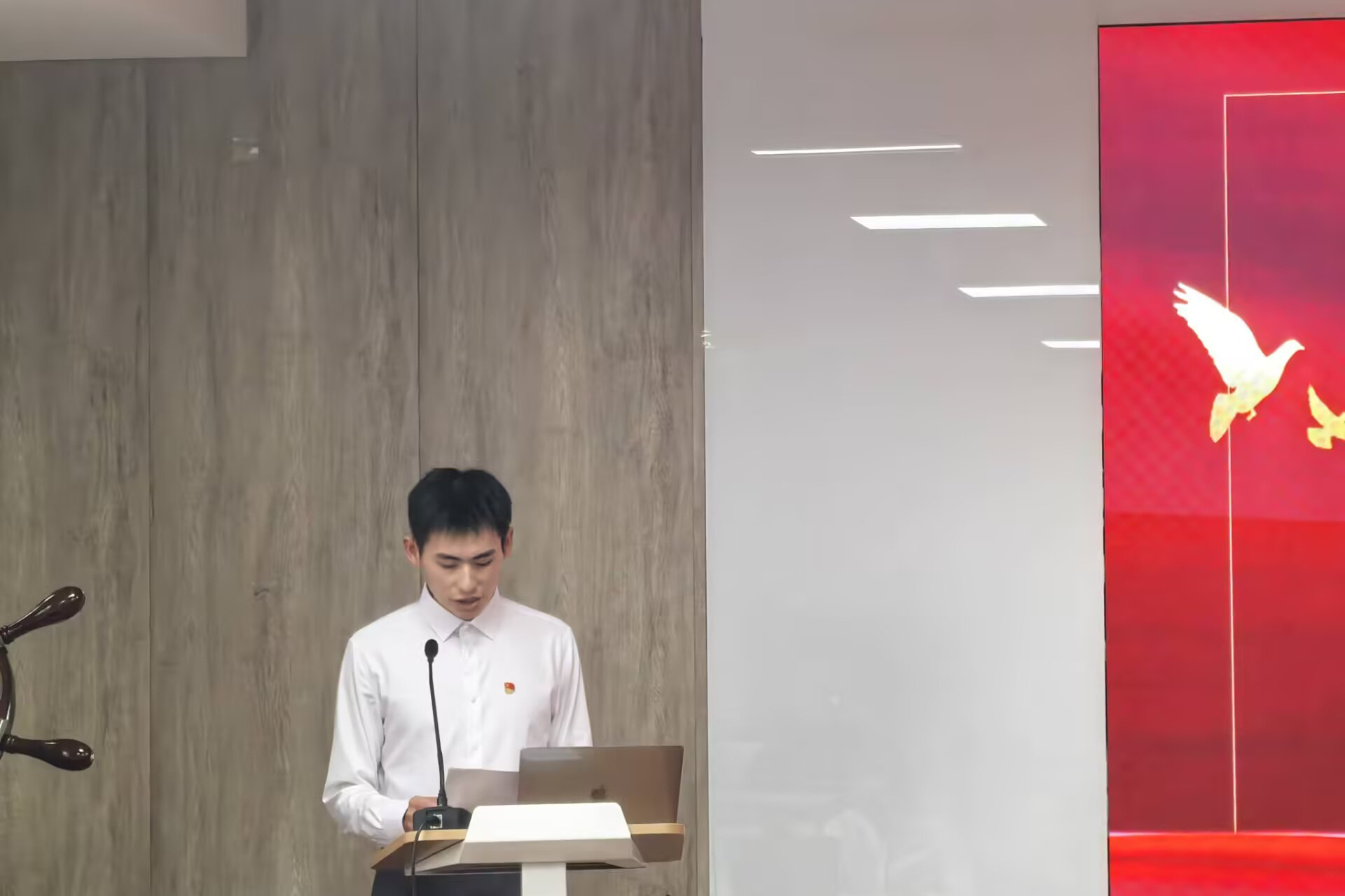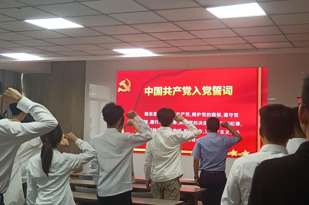 仪式在庄严的《国际歌》声中开始。张青宣读了新发展预备党员名单,并代表公司党委表示欢迎和祝贺。随后,在党员代表陈鲁文同志的领誓下,全体新党员面向党旗,高举右拳,庄严宣誓。铿锵誓言表达了为共产主义事业奋斗终身的坚定决心。宣誓后,潘庆伟、张青为预备党员佩戴党员徽章,标志着光荣使命的传承。