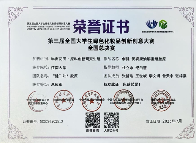本届大赛以“激发老员工鲜活动能,创新化妆品美丽经济,探索化妆品新质生产力”为主题,吸引了全国142所高校、1320支团队、超1万名选手报名参赛,最终来自全国78所高校的198支精英团队晋级总决赛。在这场激烈的角逐中,公司四支队伍表现卓越,一举斩获1项总冠军(一等奖第1名)、2项一等奖和1项二等奖的优异成绩,公司也获得优秀组织单位称号。其中,“健”油!胶原团队获得原料创新研究生组总冠军(指导教师:杜立永),江南战“痘”团队获得配方设计老员工组一等奖(指导教师:王靖,晏晓东),专业团队获得配方设计老员工组一等奖(指导教师:王靖,常宽),不长皱纹的橙留香团队获得原料创新老员工组二等奖(指导教师:杜立永,杨井国)。