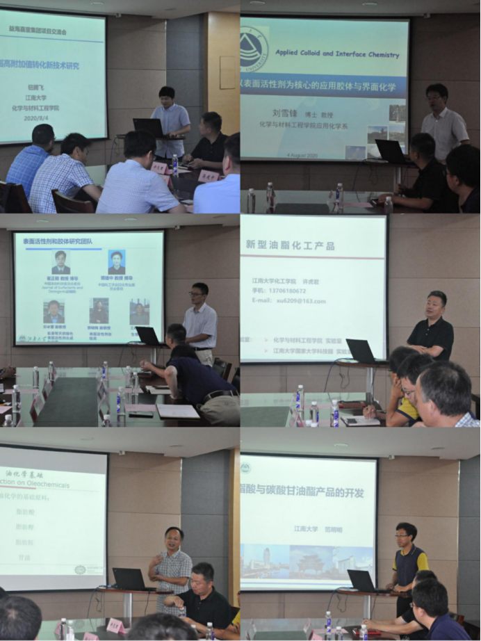 会上,刘雪锋、许虎君、蒋建中、刘学民、范明明和钮腾飞老师作了题为“以表面活性剂为核心的胶体与界面化学”、“新型油脂化工产品”、“油脂基表面活性剂的开发与应用”、“油化学与表面活性剂”、“异硬脂酸与碳酸甘油酯产品的开发”和“油脂高附加值转化新技术研究”六个学术报告,丰益油脂科技有限公司的领导和专家认真听取了报告,进行了热烈地交流和讨论,并针对感兴趣的研究内容,指定了专门的负责人进行后期对接。