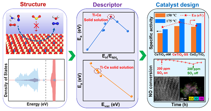 工业废气和机动车尾气排放的氮氧化物(NOx)是大气中细颗粒物(PM2.5)的主要前体物之一,还可产生光化学烟雾和硝酸型酸雨,严重危害人类生命健康和破坏生态环境。我国“十四五”规划提出了将NOx排放总量减少10% 以上的减排目标。开发高效NOx催化净化(脱硝)催化剂是实现NOx减排的关键技术问题。在本项研究中,刘冰副教授与刘小浩教授采用“DFT理论计算指导催化剂结构设计”的研究手段(图1),从原子水平上精确调控稀土二氧化铈(CeO2)的表面结构,获得了高活性、高耐硫性的Ce-Ti固溶体低温脱硝催化剂。通过综合分析DFT计算与实验结果,归纳出EH/ENH3和Evac是控制Ce-Ti催化剂活性的“反应描述符”。Ce-Ti固溶体结构的高活性源于其适中的EH/ENH3和Evac值。Ce-Ti固溶体中Ti位点特殊的几何结构和电子结构使其扮演着SO2捕获位点的作用,从而有效保护催化活性中心。该项研究为设计高活性、高耐硫性稀土铈基低温脱硝催化剂提供了新的认识和理论基础(图2)。研究工作得到了国家自然科学基金(21802054, 21878127)、江苏省自然科学基金(BK20180587)和内蒙古自治区关键技术攻关计划(2019GG321)等项目的资助。