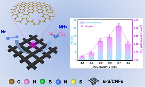基于此,课题组在电纺碳纳米纤维基体中引入杂原子使其发生电荷重排,增加相邻碳原子上的正电荷密度,可以赋予其优异的氮还原催化性能(Applied Catalysis B: Environmental, 2021, 292, 120144,图1)。在硼掺杂碳材料中,具有较强电子亲和力的硼可以作为路易斯酸位点来捕获氮的孤对电子,激活惰性的氮气分子。此外,硼的p轨道与氮气分子的π*轨道在费米能级附近相互作用,当硼的pz轨道处于合适的填充度时,有利于活化氮气分子。该工作结合静电纺丝工艺和化学气相沉积法制备了一系列B/CNFs、P-B/CNFs和S-B/CNFs催化剂材料。通过调控前驱体中硼和硫的含量,所制备的S6.23-B8.09/CNFs具有较高的氮还原法拉第效率(22.4 %)和氨产率(0.223 μmol h-1cm-2)。文章系统研究了杂原子掺杂对于硼基碳材料NRR性能的影响,结合DFT揭示了B的pz轨道中心位置与NRR性能之间的构效关系。