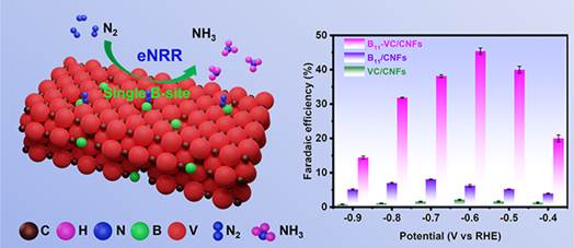 课题组利用碳纳米纤维为反应器,原位还原制备碳化钒金属间化合物(VC),利用非金属碳原子和硼原子原子在VC基体中等比例互溶的特点,通过热力学驱动固相反应在高温下将硼原子迁移扩散到VC晶体间隙中,而碳化钒有序的金属间结构可以将连续的B原子隔离成具有特定电子结构的单B位点(Adv. Energy Mater. 2021, 2102138,图2)。由于元素硼的电负性小于碳的电负性,当硼引入到碳碳化钒晶后,将会引起电荷在B-C-V结构上发生重排。其中少量电子将从硼原子和钒原子向碳原子转移,形成缺电子的硼和钒位点。此外,吉布斯自由能计算结果可以表明缺电子的B位点可以降低形成*NNH中间体的能垒。这种电子结构的合理调节可以有效地促进N2吸附、活化和第一步质子化过程。所制备的B11-VC/CNFs具有较高的法拉第效率(46.1 %)和氨产率(0.443 μmol h-1cm-2)。原位拉曼光谱进一步证实了B-C-V是eNRR过程中-NH中间体的吸附位点。这种以金属间碳化物作为基体用于生成缺电子B活性中心的策略为高效的eNRR电催化剂的设计指明了方向。