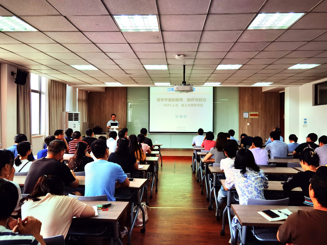 报告会上,东为富经理对杜建忠教授进行了介绍,并对杜教授的来访致以热烈的欢迎和衷心的感谢。杜教授首先介绍了国家杰出青年科学基金和优秀青年科学基金项目,指出杰出青年项目是十年磨一剑的学术积累,深入分析了时代需要什么样的青年学者。接着,杜教授重点介绍了国家自然科学基金的申报工作,全面细致地分析了国家自然科学基金的特点、评阅流程、撰写要点的建议,最后对申报过程中出现的常见问题进行了深入的剖析。杜教授高瞻远瞩的视野和具有丰富内涵的报告内容,使得在场教师和研究生受益匪浅,感受颇深。