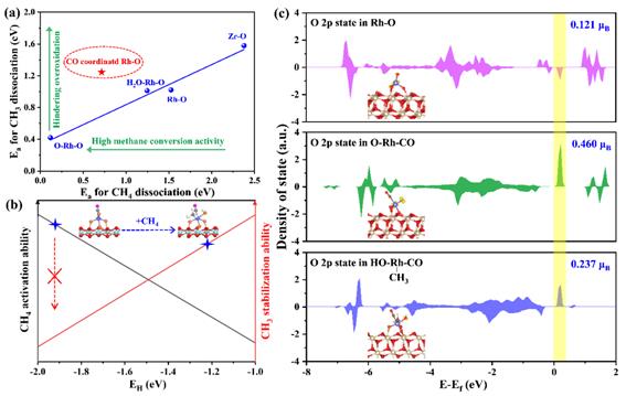 图3. CO-Rh-O配位结构突破Trade-off效应示意图及Rh-O活性位电子结构在反应过程中的动态变化