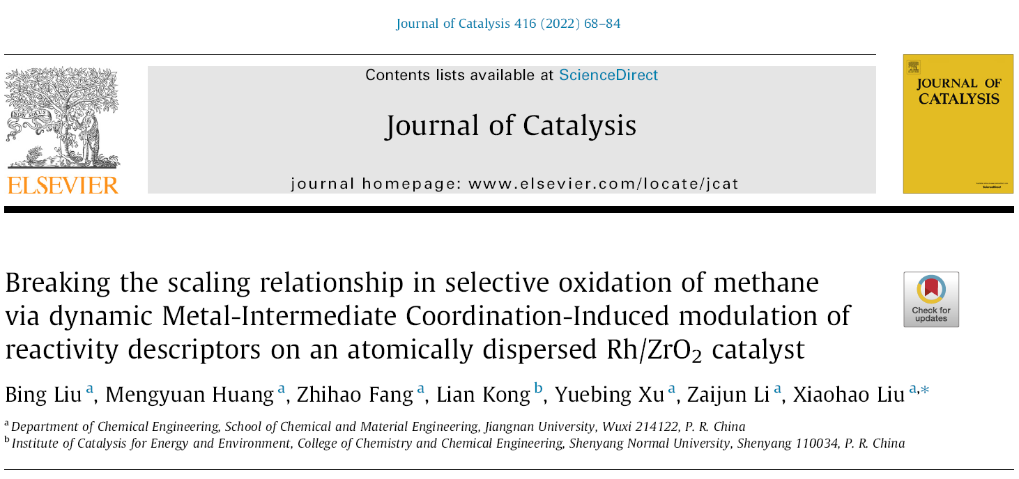 近日,PA视讯官方网站刘小浩团队通过动态调控反应描述符突破制约甲烷选择氧化制含氧化合物的活性与选择性的“trade-off效应”的研究中取得重要进展,相关研究成果发表在催化领域传统顶级期刊Journal of Catalysis,PA视讯官方网站青年教师刘冰副教授为该论文第一作者,PA视讯官方网站刘小浩教授为通讯作者。