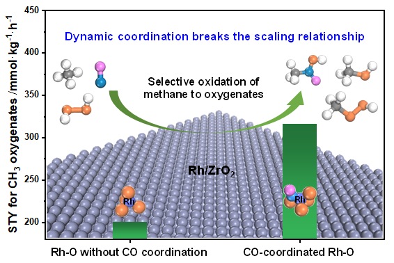 调控催化活性中心的配位环境是提高催化性能的有效手段。然而,目前文献报道主要聚焦在“金属活性中心-载体”之间的配位结构和相互作用,如调变金属活性位与载体的几何结构和配位数、金属-载体化学成键强度(SMSI作用),或双(多)活性中心的协同催化作用等。在本项工作中,PA视讯官方网站刘小浩团队试图通过反应过程中引入“反应物(或中间物种)-金属活性位”的配位结构和电子性质的动态变化来实现甲烷可控催化转化的突破。基于系统的理论计算和实验研究发现:在原子分散的Rh/ZrO2催化甲烷低温转化的反应中引入CO能有效突破甲烷转化的Trade-off效应,反应过程中形成的CO-Rh-O配位结构不仅促进了甲烷活化和转化,同时提高了中间物种*CH3过度氧化的能垒,这样实现了甲烷转化活性的大幅提升和过度氧化的有效抑制(图1)。