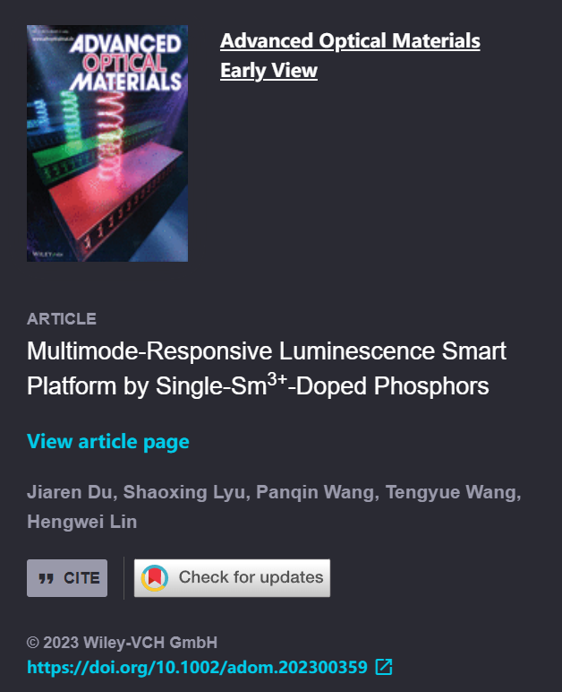 近日,PA视讯官方网站林恒伟教授光功能材料研究团队,在无机智能响应性发光材料上取得研究进展,相关成果以“Multimode-Responsive Luminescence Smart Platform by Single-Sm3+-Doped Phosphors”为题发表在光学权威期刊Advanced Optical Materials上(原文链接:https://onlinelibrary.wiley.com/doi/10.1002/adom.202300359)。该项工作的主要贡献者为硕士研究生吕绍星、王潘琴和王腾跃同学,论文的通讯作者为林恒伟教授、杜家仁副教授。