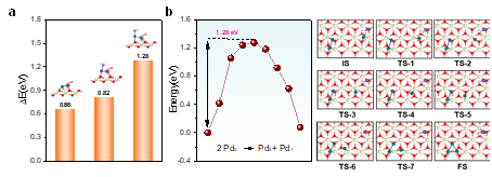 图4.H2O或H2O解离的*OH吸附在双钯位点上对其迁移和聚集的影响