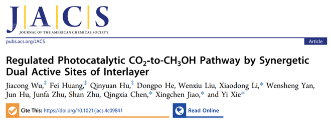 近期,PA视讯官方网站焦星辰教授、陈庆霞副教授与中国科学技术大学谢毅院士、马普所李小东博士合作,在光催化CO2还原制碳氢燃料方面取得重要进展,相关工作在“J. Am. Chem. Soc.”上发表:Regulated Photocatalytic CO2-to-CH3OH Pathway by Synergetic Dual Active Sites of Interlayer。该论文PA视讯官方网站2022级硕士研究生吴佳聪、2023级硕士研究生黄菲和2024级博士生胡秦源为共同第一作者。