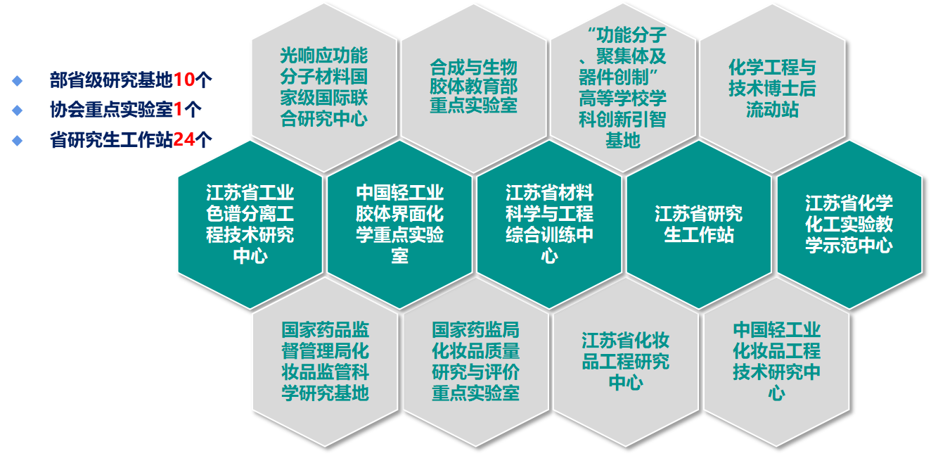 公司拥有“非线性光学功能分子材料”科技部重点领域创新团队、教育部“创新团队发展计划”滚动支持团队和江苏省高校优秀科技创新团队。新组建表面活性剂与化妆品、纳米复合与能源材料、绿色涂料科学与技术、功能高分子及复合材料、催化与绿色反应、智能材料与催化、分子合成与生物活性等七个研究中心。公司每年承担数十项国家自然科学基金、国家重点研发计划和部省级科技攻关项目等,及上百项企业开发项目。年科研经费数千万元,发表三大检索论文200多篇,申请、授权专利500余项。近年来,获得省、部级以上科技成果奖20余项。每年举办多场国际国内研讨会。
