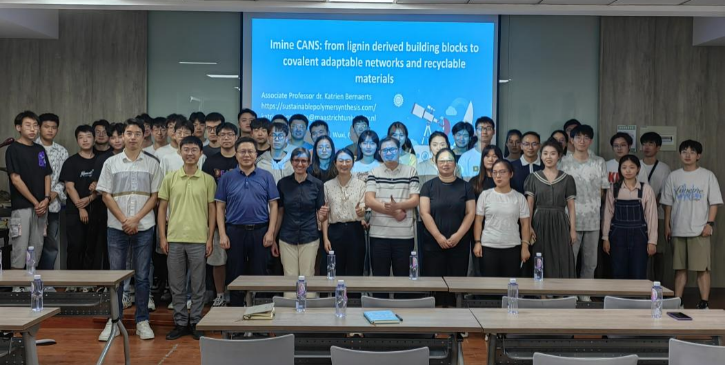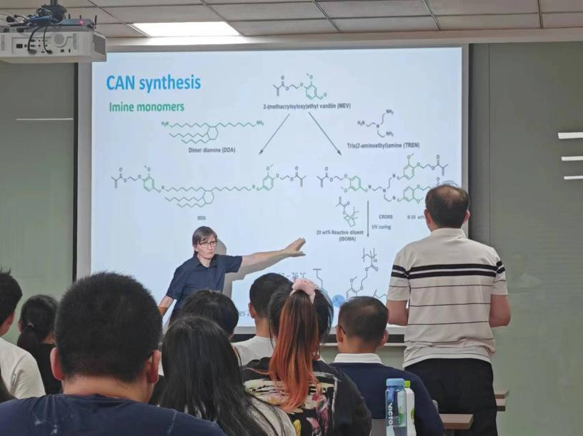 2024年9月28日下午,荷兰马斯特里赫特大学Katrien Bernaerts副教授应邀前往公司访问,并于PA视讯官方网站A316学术报告厅做了一场题为“From Lignin Derived Building Blocks to Covalent Adaptable Networks and Recyclable Materials (从木质素衍生的结构单元到共价自适应网络与可回收材料)”的精彩学术报告,并与公司师生进行了广泛的学术讨论与交流。会议由黄晶副教授主持,她首先对KatrienBernaerts进行了介绍并对其到访表示诚挚的敬意与欢迎。Katrien以循环经济与可持续聚合物材料的研究为大背景,主要围绕由木质素及其衍生结构构建的共价适应性网络和可回收材料的最新研究进行展开,重点从木质素亚胺Vitrimer的制备作为导向切入点,通过改性木质素得到富含亚胺动态共价键的木质素基Vitrimer,充分发挥亚胺键独特的动态交换和水解性,使其显示出优异的自修复、自清洁和可回收等特性。这些工作有助于系统的可持续性和循环性,为绿色发展领域的环境可持续战略提供了一条有希望的途径。此次报告会以全英文形式进行,吸引了众多师生前来参加,学术氛围浓厚。