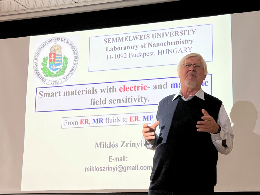 首先,Miklós Zrínyi教授作了题为“Smart polymer composites with electric and magnetic field sensitivity”的报告,介绍了具有电响应和磁响应的智能高分子。从电磁响应金属粒子及其掺杂在高分子的基本原理出发,详细阐述了将电磁响应粒子掺杂入高分子中,使高分子表现出电磁响应的形变应变功能及在电磁场下旋转驱动的性能,基于在不同的电磁作用下响应粒子的高分子的旋转方向和速率,讨论了电磁响应高分子应用于人造肌肉和微型发动机上的应用前景。