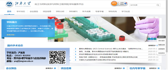 化学与材料学科服务平台内容按一级学科划分,对学科专业信息资源、院系资源和图书馆资源等进行聚合重组,包括员工动态、会议预告、项目信息、学科分析、学科期刊、学术成果、论文收录、专家学者、学科机构、学习社区等栏目;读者可以通过互动模块在平台上提交自己的意见、建议、推荐资源,与学科馆员进行在线咨询。