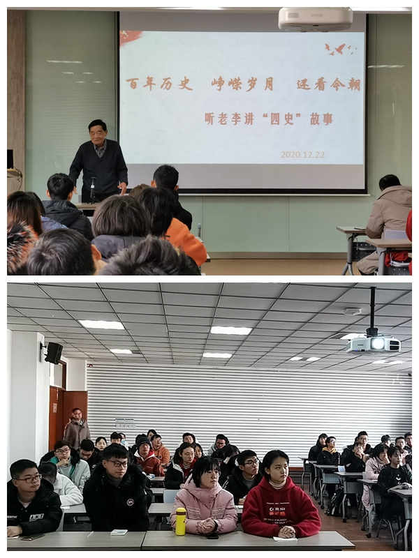 6月27日,习近平总书记在给复旦大学青年师生党员的回信中指出:“面向未来,走好新时代的长征路,我们更需要坚定理想信念、矢志拼搏奋斗。希望广大党员特别是青年党员认真学习马克思主义理论,结合学习党史、新中国史、改革开放史、社会主义发展史,在学思践悟中坚定理想信念,在奋发有为中践行初心使命,努力为实现‘两个一百年’奋斗目标、实现中华民族伟大复兴的中国梦贡献智慧和力量。”历史是最好的教科书和清醒剂,为深入学习 “四史”,12月22日上午,在化工楼A316会议室,原无锡轻工大学党委副书记、副董事长,现校关工委顾问、党委兼职组织员,无锡市关工委报告员李宗元老师讲“四史”故事给同学们听,带着同学们回忆历史、以史为鉴,激励同学们把握当下、赢得未来。