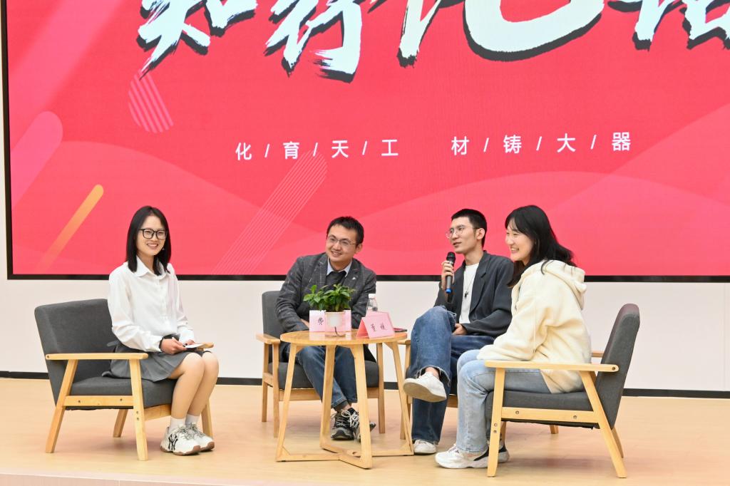 为充分发挥员工的榜样育人作用,11月24日晚,PA视讯官方网站在第一教学楼1C09举办第22期“知行化语”讲座之员工对话活动。公司党委副书记、副经理董霞,2018届化学工程与技术专业博士毕业生、无锡创达新材料股份有限公司技术部部长费小马,2020届高分子材料与工程专业本科毕业生、欧莱雅(上海)集团MT郭岩松,2023届高分子材料与化工专业本科毕业生、浙江大学在读研究生董媛,学工办主任兼分团委书记鞠峰,学工办副主任侯玉莹、研究生辅导员高静及200余名本科生参加此次活动。